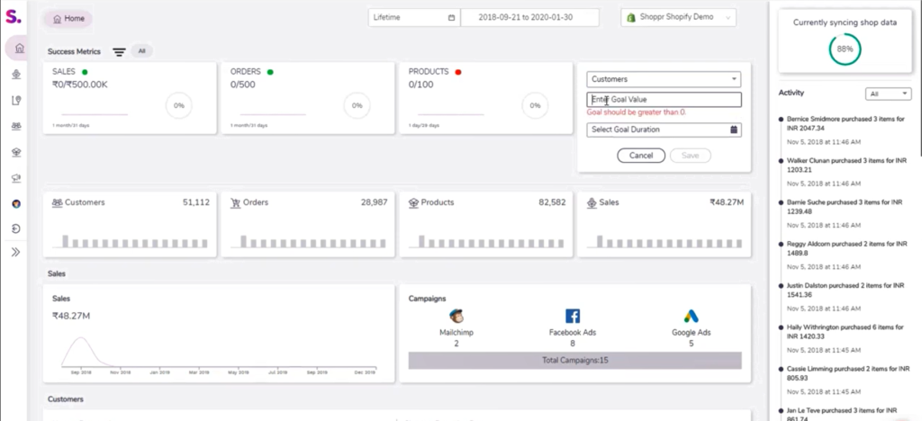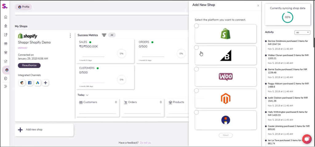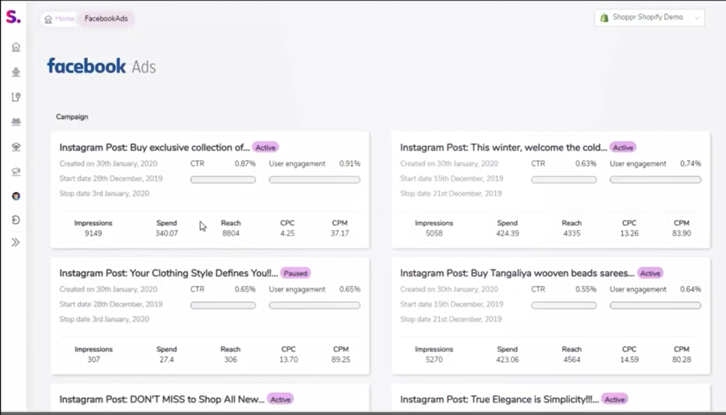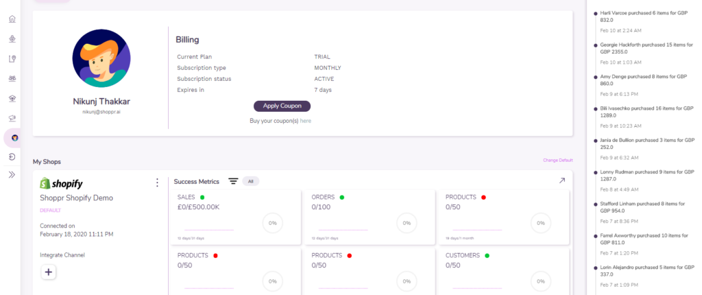 Shopprone seamlessly blends the key metrics from your store and all your marketing channels, and presents the data in an user friendly interface, which is heavy on data but light on your eyes. Get a holistic view of everything that impacts your business in a short span of time with Shoppr.